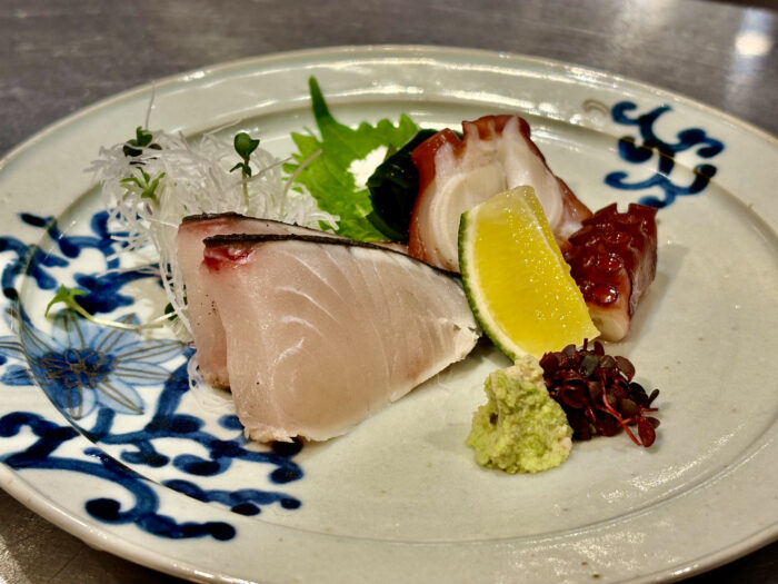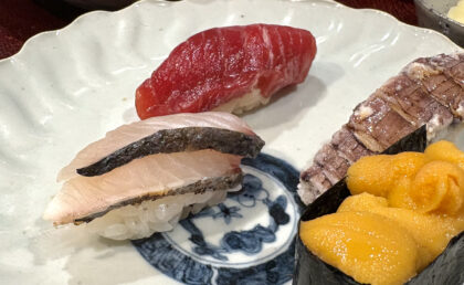 当店では皮目を少し炙った「焼き霜」で、お刺身または握りでお出ししております。