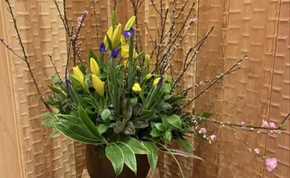 モモ(枝) LAユリ(黄色) アイリス(紫)